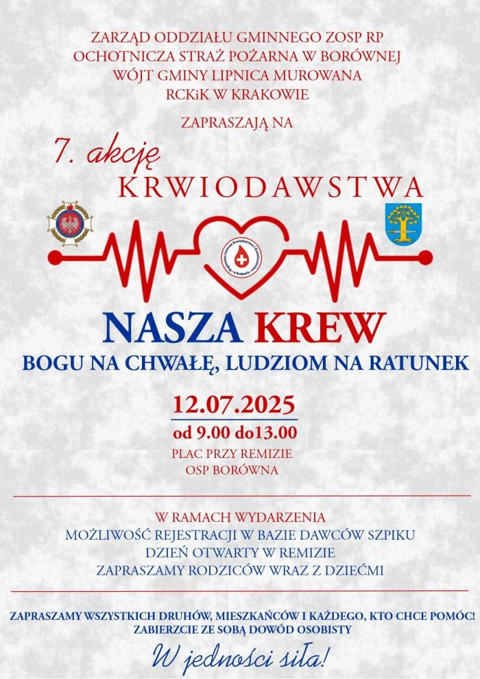 Wójt Gminy, Zarząd Oddziału Gminnego ZOSP RP w Lipnicy Murowanej, wszystkie jednostki OSP z terenu gminy, na czele z gospodarzami akcji OSP Borówna, zapraszają na VII Akcję Krwiodawstwa. Sobota, 12 lipca od 9:00 do 13:00 przy remizie w Borównej.