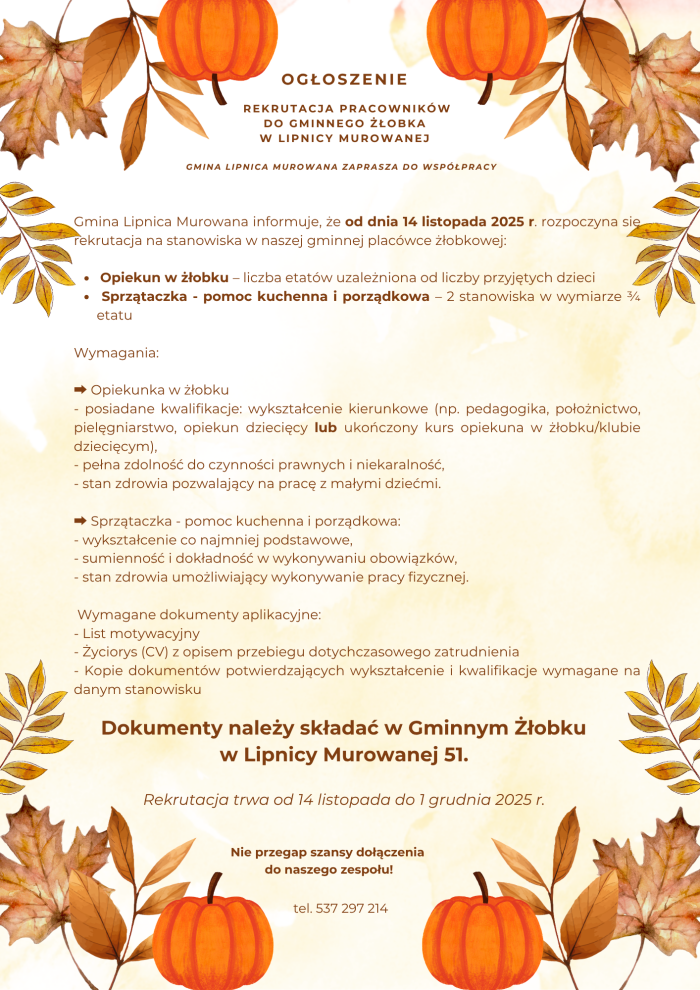Informujemy, że od 14 listopada do 1 grudnia 2025 roku potrwa rekrutacja pracowników do Gminnego Żłobka.
