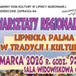 Opublikowane przez Zostaw swoje przemyślenia Zapraszamy wszystkich miłośników kultury i lokalnych tradycji na Warsztaty regionalne pn. „LIPNICKA PALMA W TRADYCJI I KULTURZE” ,które odbędą się 18 marca 2026 r. o godz. 9:30 w sali widowiskowej Gminnego Domu Kultury w Lipnicy Murowanej. W programie warsztatów: – tradycja oraz historia Konkursu Palm w Lipnicy Murowanej, – projekcja archiwalnych filmów z Niedzieli Palmowej, – warsztaty wykonywania lipnickiej palmy, – strojenie oraz warsztaty wykonywania bibułowych kwiatów. Zgłoszenia przyjmowane są pod nr tel. 14 6852108. Udział w warsztatach jest bezpłatny. Ilość miejsc ograniczona! Wydarzenie dofinansowano ze środków Ministra Kultury i Dziedzictwa Narodowego pochodzących z Funduszu Promocji Kultury – państwowego funduszu