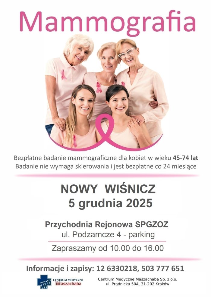 Na prośbę Placówki Terenowej KRUS w Bochni informujemy, że w ramach wspólnej akcji profilaktyki zdrowotnej KRUS i NFZ pod hasłem „Weź się zbadaj” 5 grudnia 2025 r. w godzinach od 10:00 do 16:00 na parkingu przy Samodzielnym Publicznym Gminnym Zakładzie Opieki Zdrowotnej w Nowym Wiśniczu (ul. Podzamcze 4) będzie stał MAMMOBUS, do którego zapraszane są panie w wieku 45 – 74 lat na badania mammograficzne. Udział w badaniach jest darmowy i nie wymaga skierowania.
