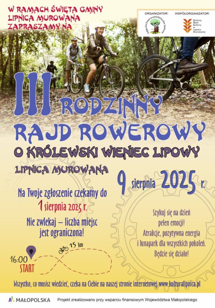 Rajd organizowany jest we współpracy z Gminnym Domem Kultury w Lipnicy Murowanej. Ilość miejsc jest ograniczona, dlatego czekamy na zgłoszenia do 1 sierpnia. Szczegóły dotyczące rajdu oraz regulamin dostępne są na stronie internetowej GDK. Serdecznie zapraszamy rodziny, miłośników rowerowych wycieczek i wszystkich chętnych do wspólnej zabawy i aktywnego spędzenia czasu na świeżym powietrzu. Nie przegapcie tej okazji, by poczuć ducha sportowej rywalizacji i cieszyć się pięknem naszej gminy! Projekt jest realizowany dzięki wsparciu finansowemu Województwa Małopolskiego, co pozwoliło na przygotowanie wielu atrakcji dla uczestników rajdu. W tym dniu organizatorzy przygotowali także szereg innych niespodzianek (w ramach Święta Gminy) dla małych i dużych, to m.in.: lunapark , interaktywny program dla dzieci pt. „Piraci z Karaibów”, występy zespołów oraz dyskoteka z topowymi DJ-ami. Serdecznie zachęcamy do udziału i wspólnego świętowania! Nie może Was zabraknąć – koniecznie bądźcie z nami – czekamy na Was w sobotę 9 sierpnia!