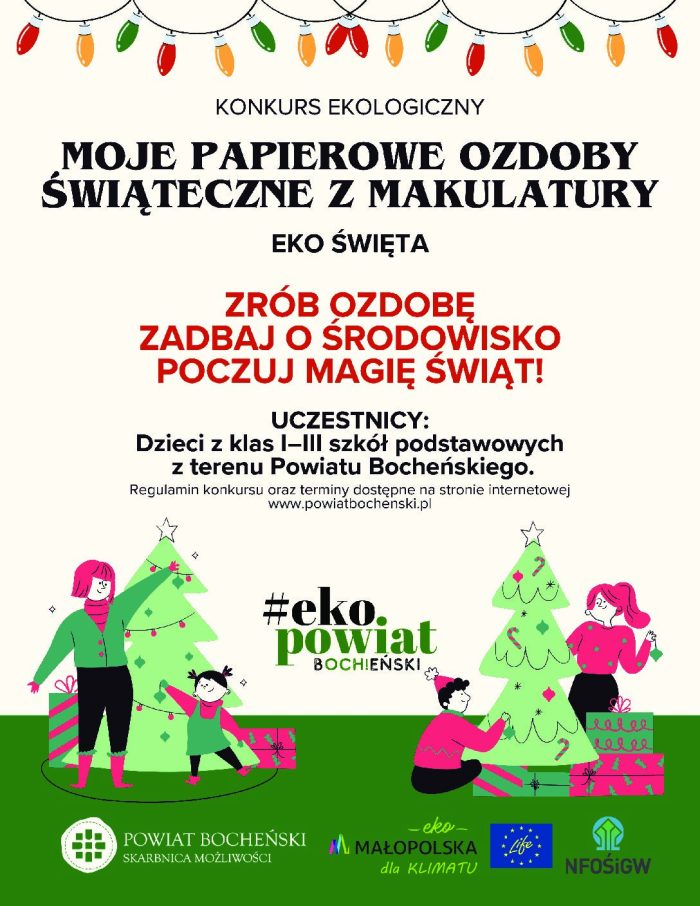 Na prośbę Starostwa Powiatowego w Bochni serdecznie zachęcamy do udziału w konkursie ekologiczny „MOJE PAPIEROWE OZDOBY ŚWIĄTECZNE Z MAKULATURY -EKO ŚWIĘTA”.