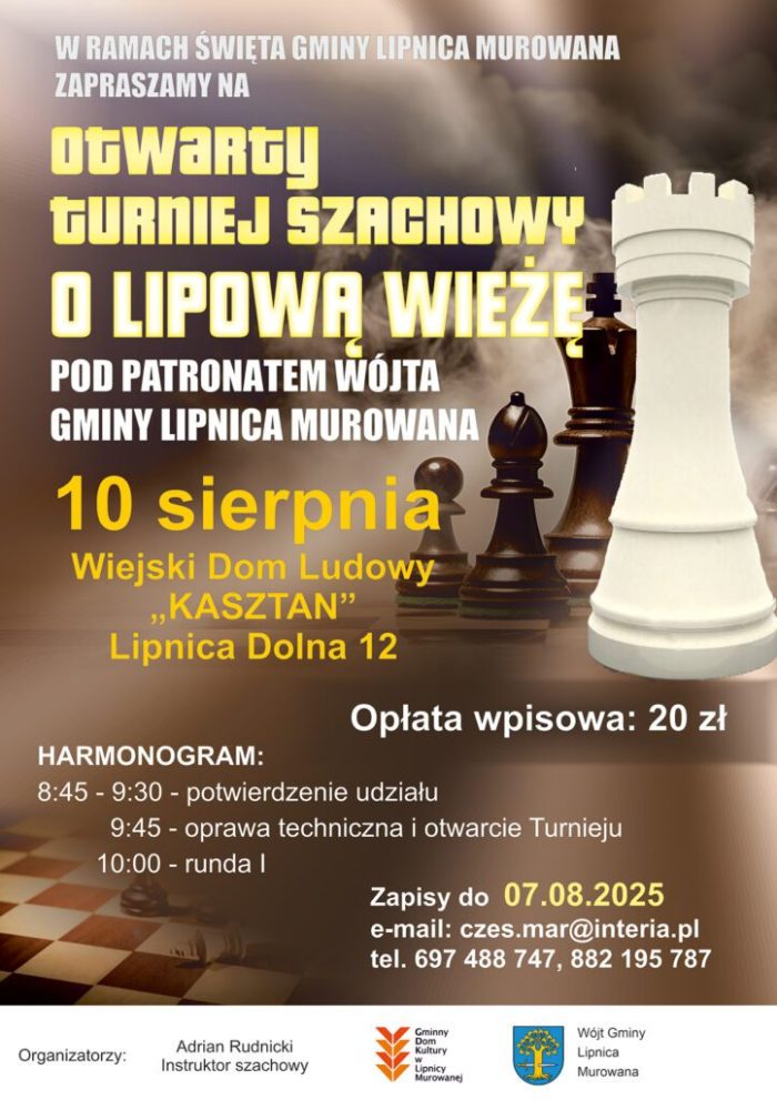 Serdecznie zapraszamy miłośników szachów, do udziału w otwartym Turnieju szachowym o „Lipową Wieżę” pod patronatem Wójta Gminy Lipnica Murowana, który odbędzie się w ramach tegorocznego Święta Gminy, w dniu 10 sierpnia (niedziela) w Wiejskim Domu Ludowym „Kasztan” w Lipnicy Dolnej.