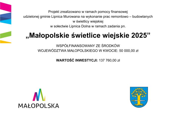 Inwestycja została zrealizowana dzięki pomocy finansowej udzielonej gminie Lipnica Murowana w ramach zadania pn. „Małopolskie świetlice wiejskie 2025”.