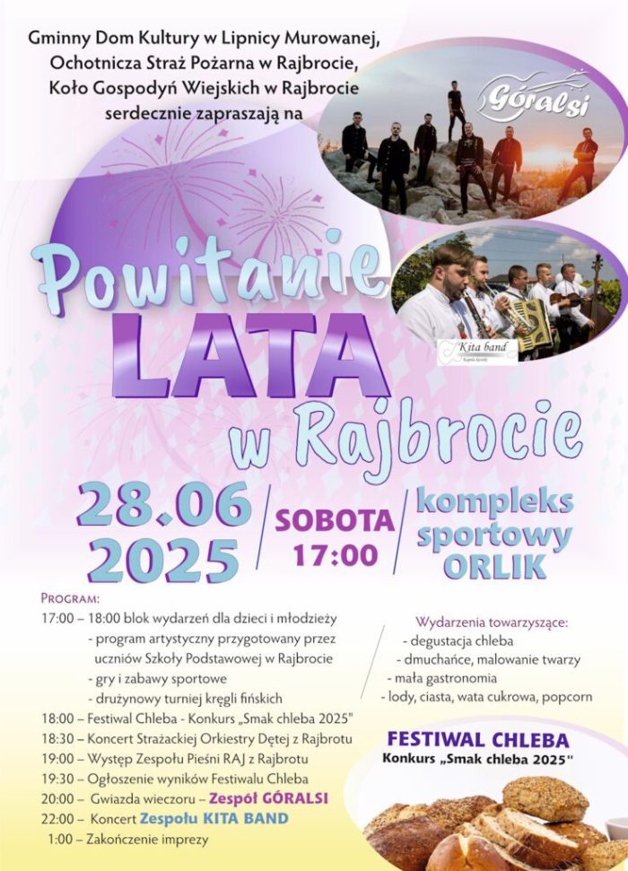 W programie przewidziano moc atrakcji dla całych rodzin. Dzieci zapraszamy na dmuchańce, malowanie twarzy, warkoczyki, konkursy z nagrodami, słodkości. Dla miłośników kręgli fińskich zostanie zorganizowany turniej drużynowy. Szczególnym punktem programu będzie Festiwal Chleba, podczas którego odbędzie się konkurs na „Smak Chleba 2025” (na zgłoszenia do konkursu czekamy do dnia 23 czerwca). Chleby zostaną zaprezentowane, ocenione, a najsmaczniejsze nagrodzone. Uczestnicy Powitania Lata też będą mieli okazję posmakować wypieków podczas przygotowanej degustacji. Na scenie z programem artystycznym wystąpią: uczniowie Szkoły Podstawowej w Rajbrocie, Strażacka Orkiestra Dęta z Rajbrotu, zespół Pieśni Raj z Rajbrotu oraz Zespół „Kita Band”. Gwiazdą wieczoru będzie Zespół Góralsi.