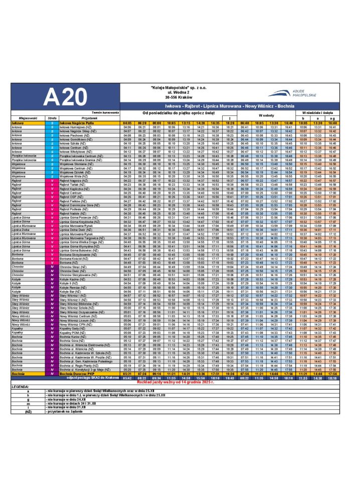 Informujemy, że od 14.12.2025 r. zmieni się rozkład jazdy linii A20 Kolei Małopolskich: Pliki do pobrania Rozkład od 14.12